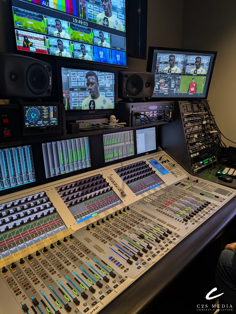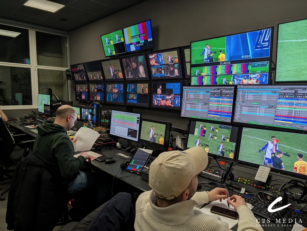 The Challenge: The French Football League planned the ON-AIR on 15th August 2025, leaving three weeks for the studio upgrade. C2S led a dedicated team to understand the client’s needs and concept a working solution for the first phase. This included upgrading the C.A.R. (Nodal) and the PCR (Video production room, Audio room, Vision / Light room), adding 4 x LSM positions to the PCR, adding new cameras to the studio and connecting the ten postproduction rooms and commentary rooms to the C.A.R.