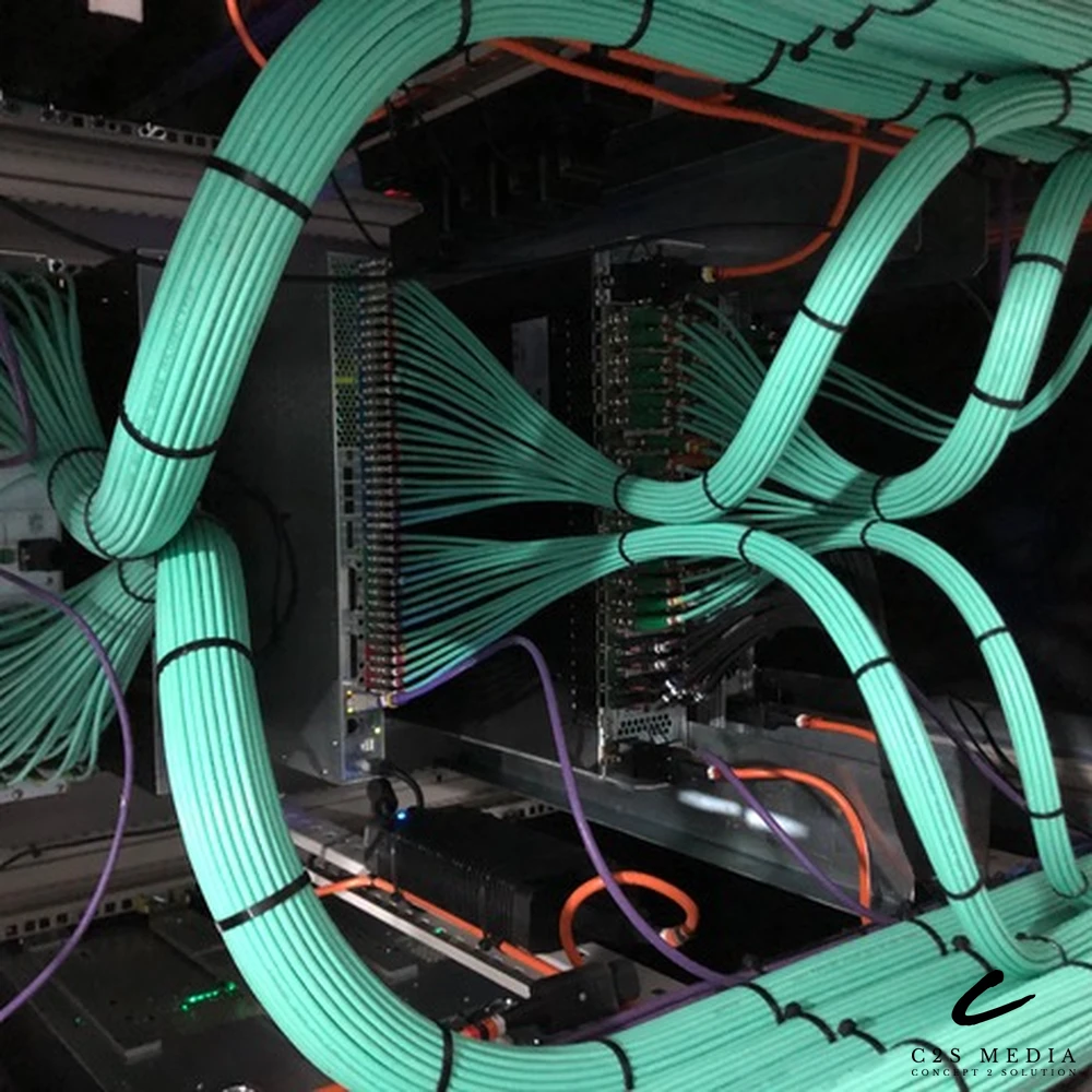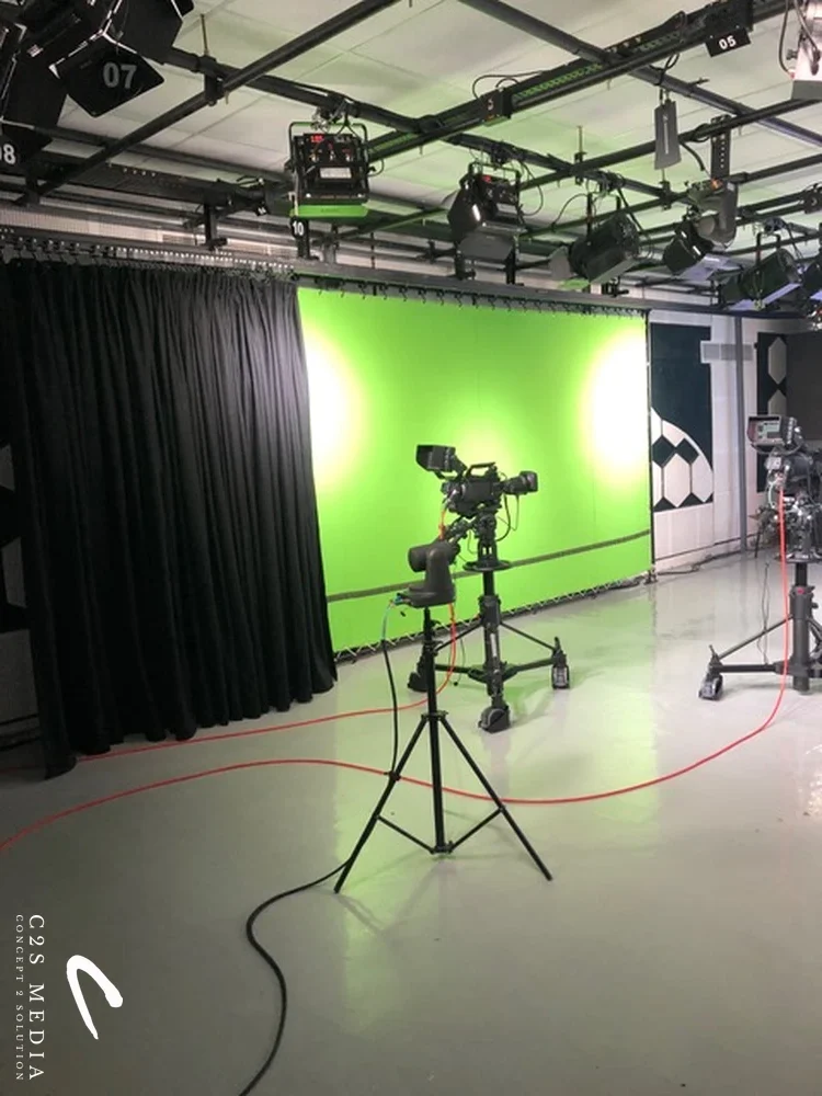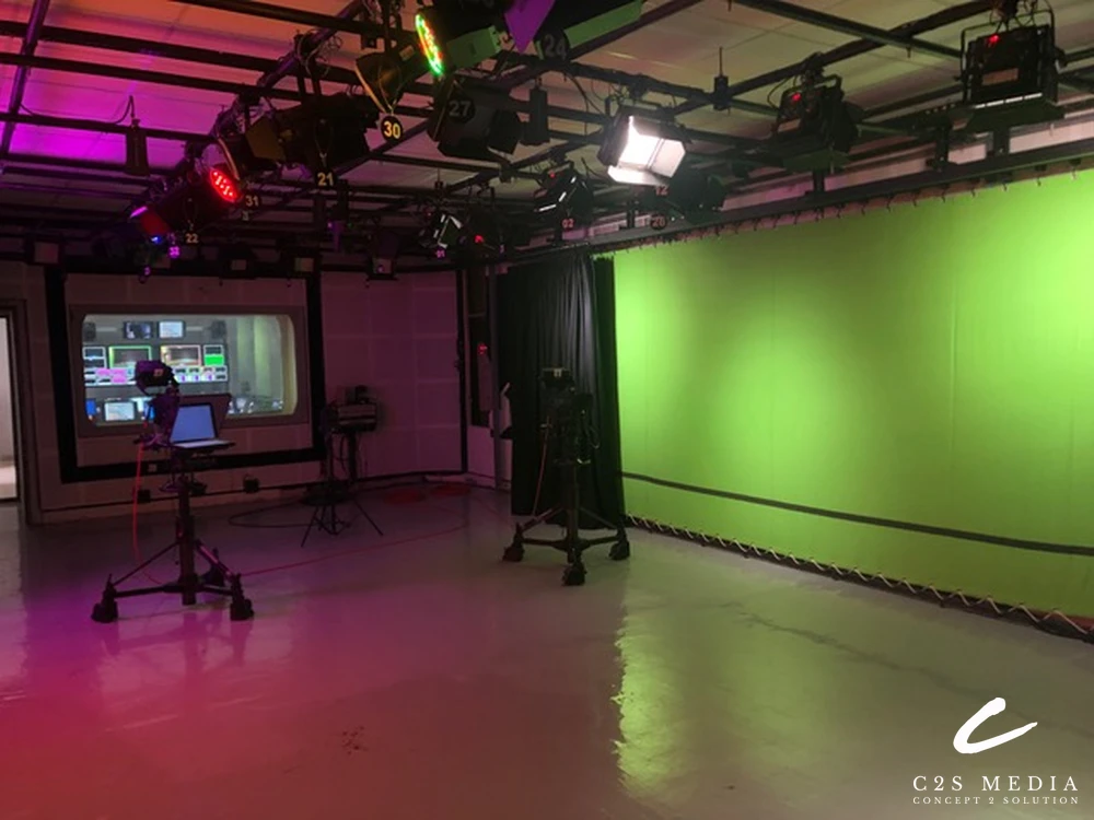 A mix of Sony Broadcast Cameras and Panasonic PTZ cameras operate in a studio with Full cyclorama, green screen and white screen lit by up to 60 x Canara lights; the grid, lights, and screens all installed by C2S.